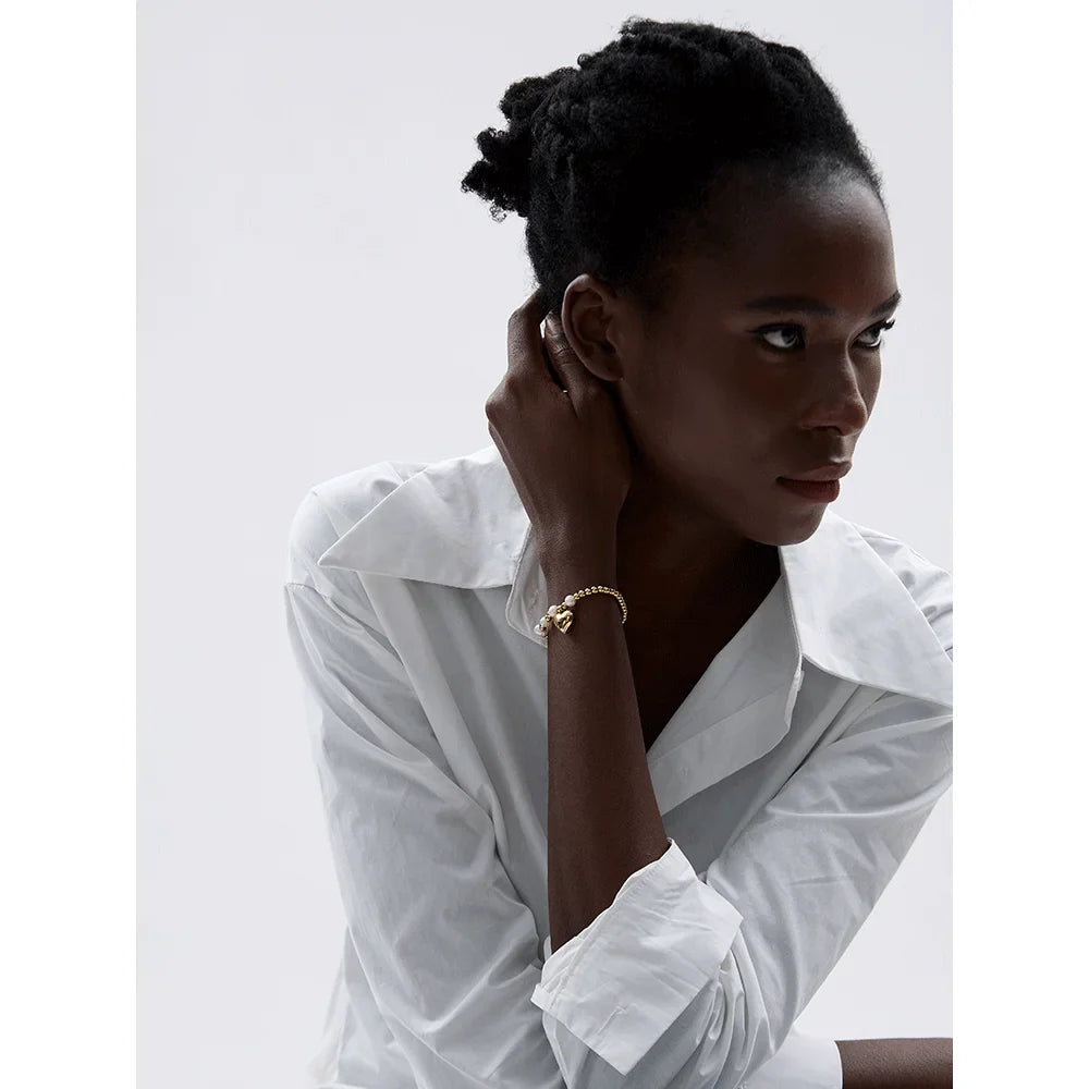 Adorn your wrist with the elegance of our Heart & Pearl Beaded Chain Bracelet. Crafted with a beautiful beaded chain and delicate heart and pearl details, this bracelet is the perfect finishing touch to any look. Transform yourself into a true style icon with this exclusive piece on your wrist.
